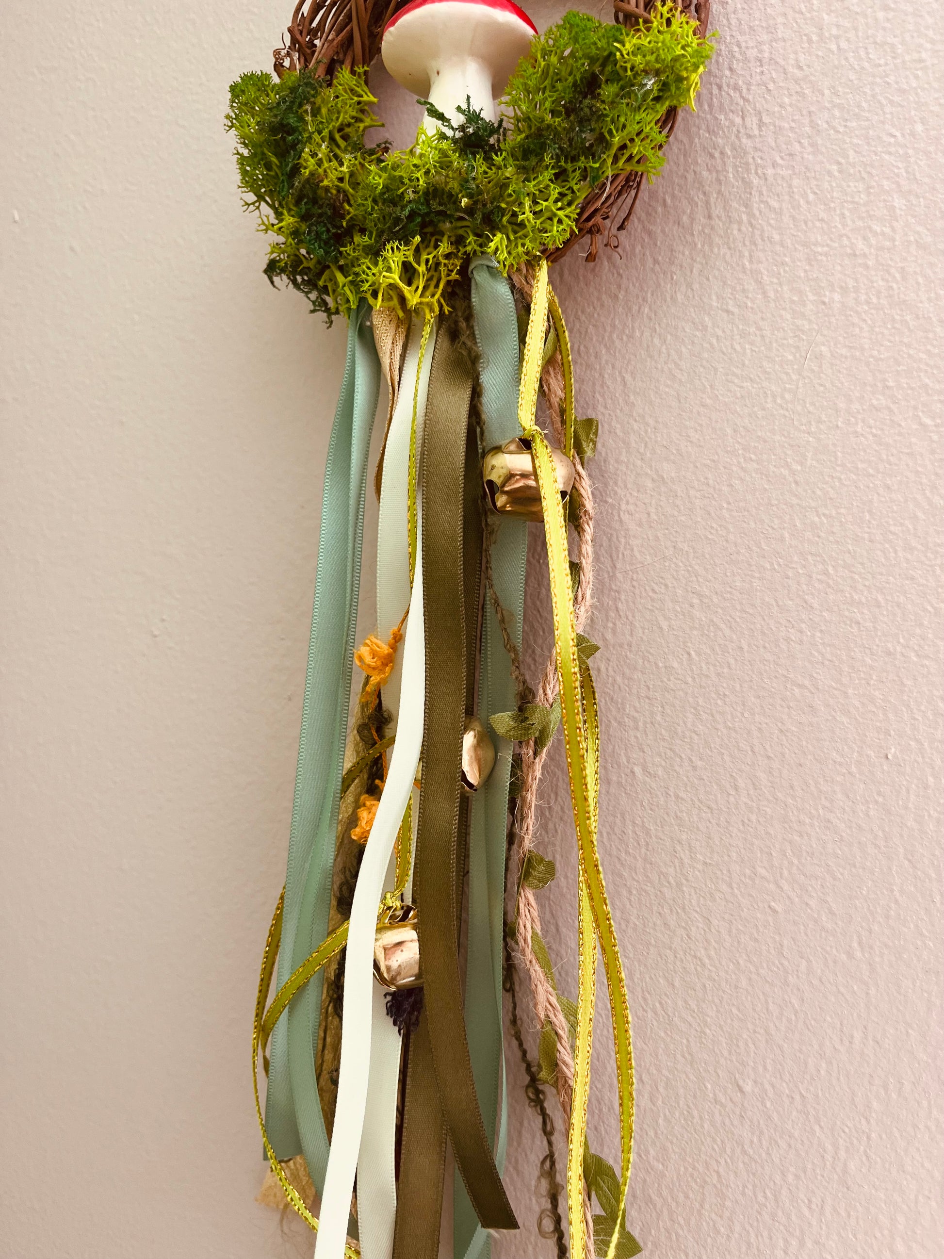 Bring a touch of enchantment into your space with this miniature magical wreath, lovingly handmade in my cozy workshop by The Eclectic Witch. Nestled with lush moss and a whimsical little toadstool, this tiny round wreath radiates forest-fairy charm and mystical vibes. A soft green ribbon trails from the bottom, adorned with delicate gold bells that tinkle with the gentlest whisper of magic. Perfect for hanging in a special nook, on a door, or as a seasonal altar accent, this little piece is a celebration of nature, imagination, and the kind of witchy whimsy that sparks joy.