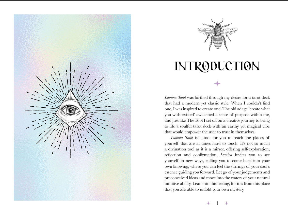 Lumina Tarot is a tool for you to access the places in yourself that are at times hard to reach. It's not so much a divination tool as it is a mirror, offering self-exploration, reflection and confirmation. Lumina Tarot invites you to see yourself in new ways, calling you to come back into your own knowing, where you can feel the stirrings of your soul's essence guiding you forward.