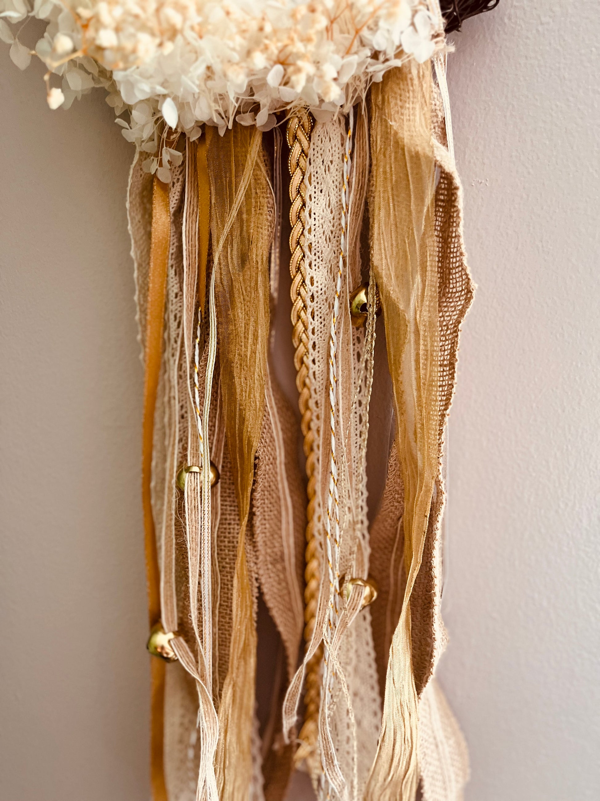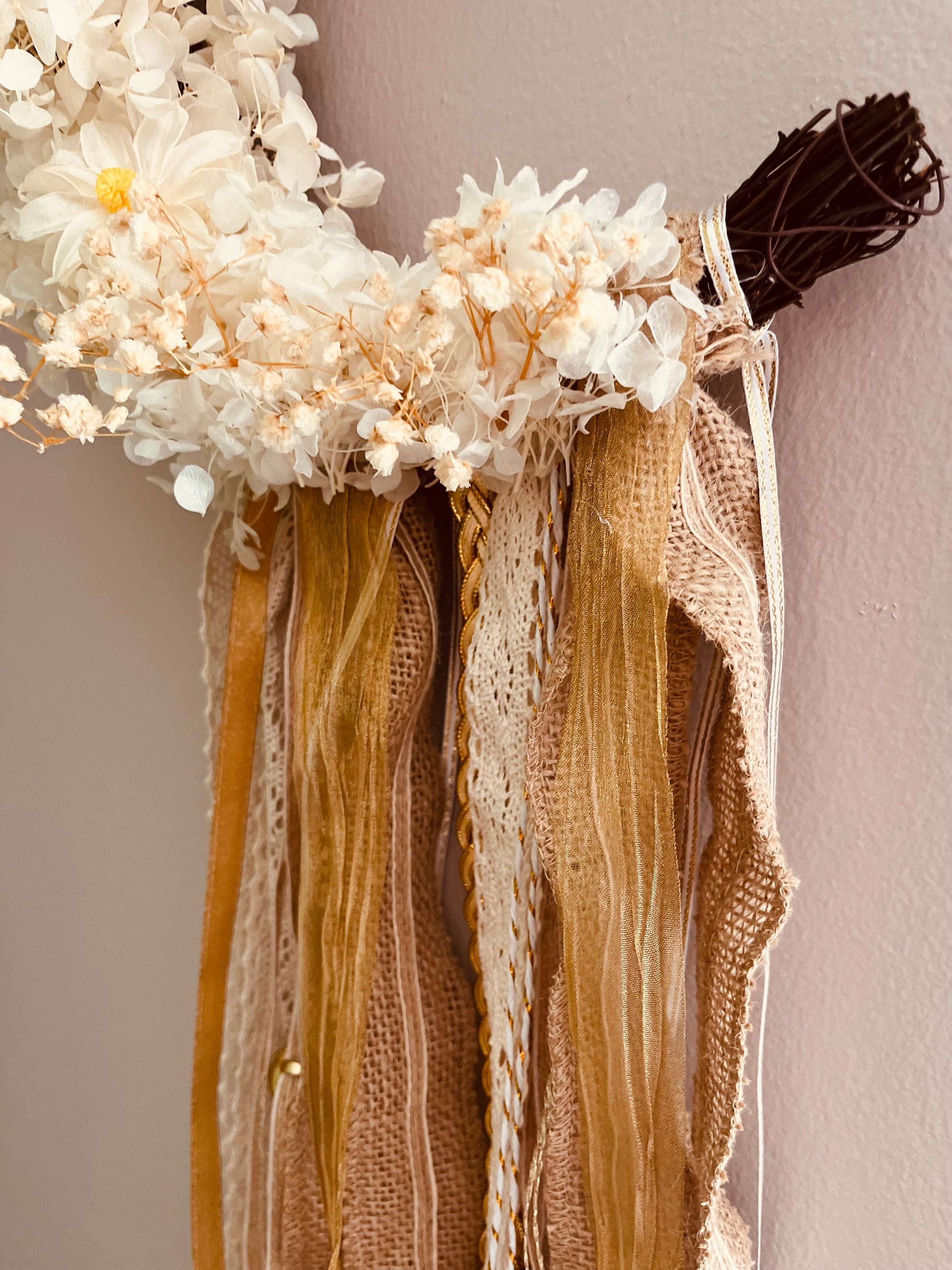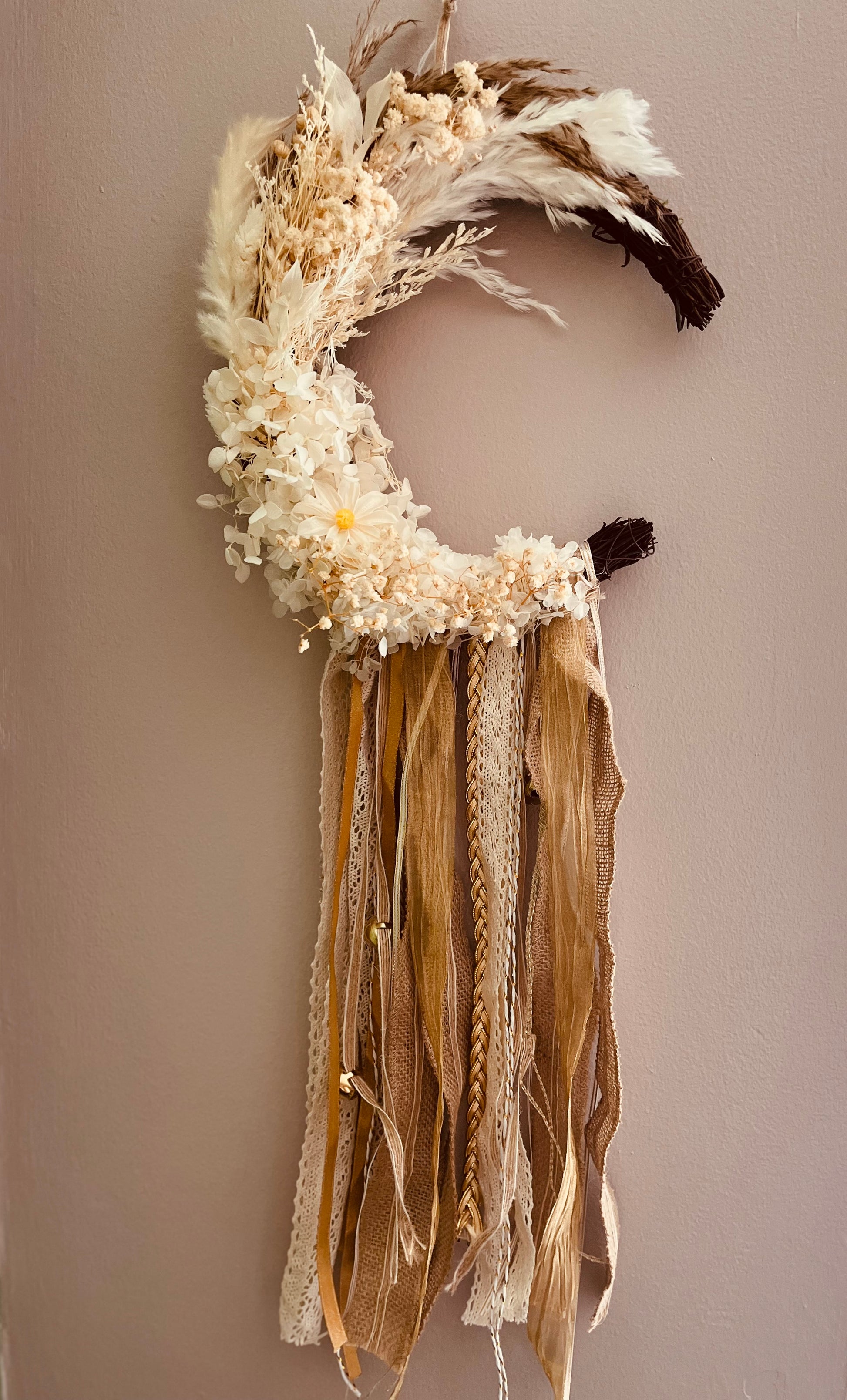 Handcrafted in my cozy little workshop, this enchanted wreath was made with love, care, and a touch of magic. Shaped like the sacred crescent moon, it’s adorned with an array of artificial flowers and a mixture of different textured ribbons that dance with every breath of air.